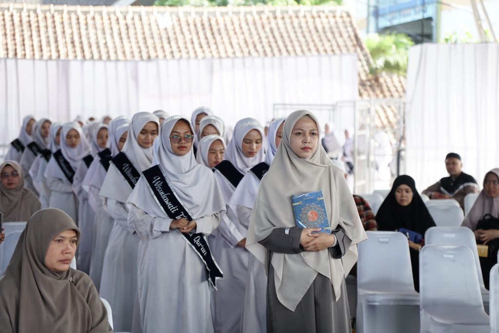Potret saat santri kelas XII SMA Daarut Tauhiid Boarding School (DTBS) Putri mengikuti kegiatan Wisuda Tahfidz di Dome Central V, pada Sabtu (14/2/2026).